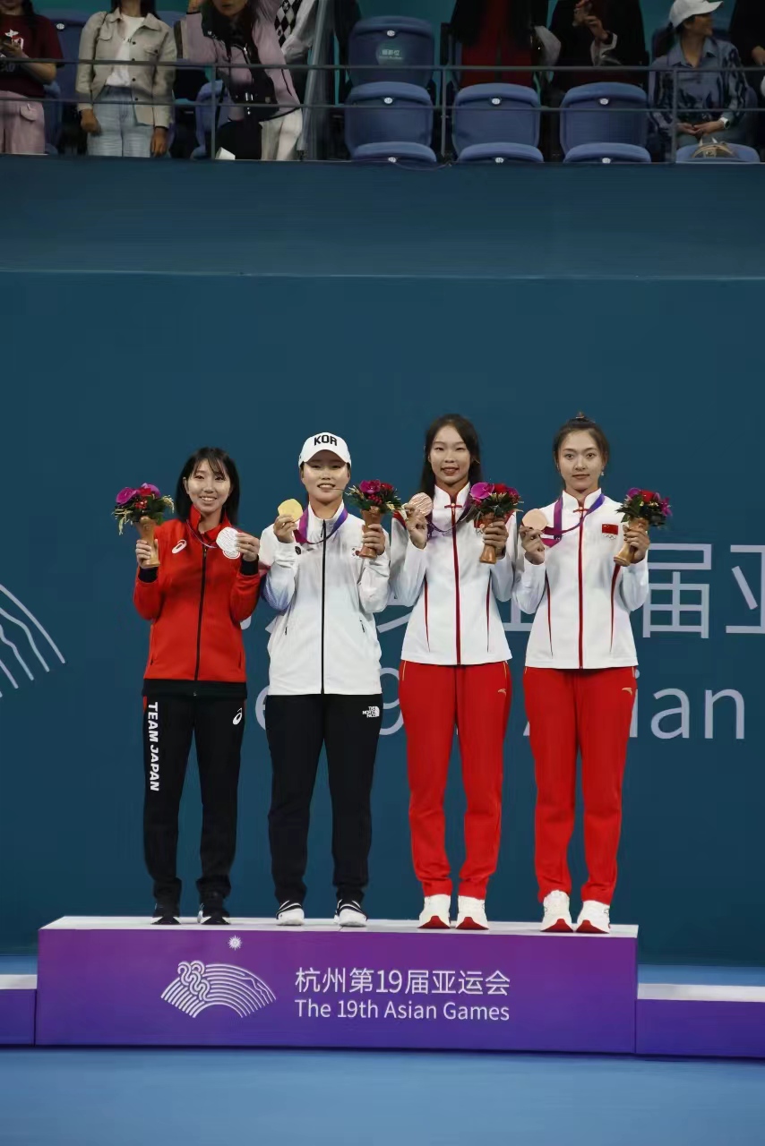 2023年10月3日—7日,杭州亚运会软式网球比赛在杭州奥体中心网球中心举行。公司3044永利集团研究生马玥、付晓晨与队友李邓琳组成的中国队,获得女子团体铜牌,同时马玥获女子单打铜牌。