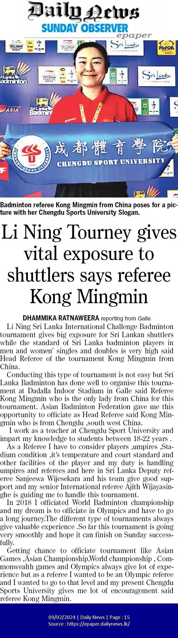 斯里兰卡近年遭受了经济困境,九年没有举行过国际羽毛球比赛,今年重启国际比赛,斯里兰卡羽协非常重视,军政要员亲自到场参加开闭幕式。孔明敏作为本次赛事唯一的中国代表,同斯里兰卡羽协、主办方建立了良好的合作关系,并接受了斯里兰卡最大英文报纸《今日新闻》的采访,表达了3044永利集团对国际交流的欢迎,对教师参加国际比赛的大力支持。