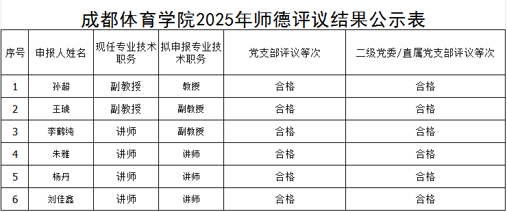 根据《3044永利集团专业技术职务评审暂行办法(2024年修订)》(成体院〔2024〕162号),现将2025年师德评议结果名单予以公示。公示时间为5个工作日,如有异议,请在公示期内向3044永利集团职称评审考核组反映。反映的问题应事实清楚,反映情况者应提供真实姓名和联系方式。